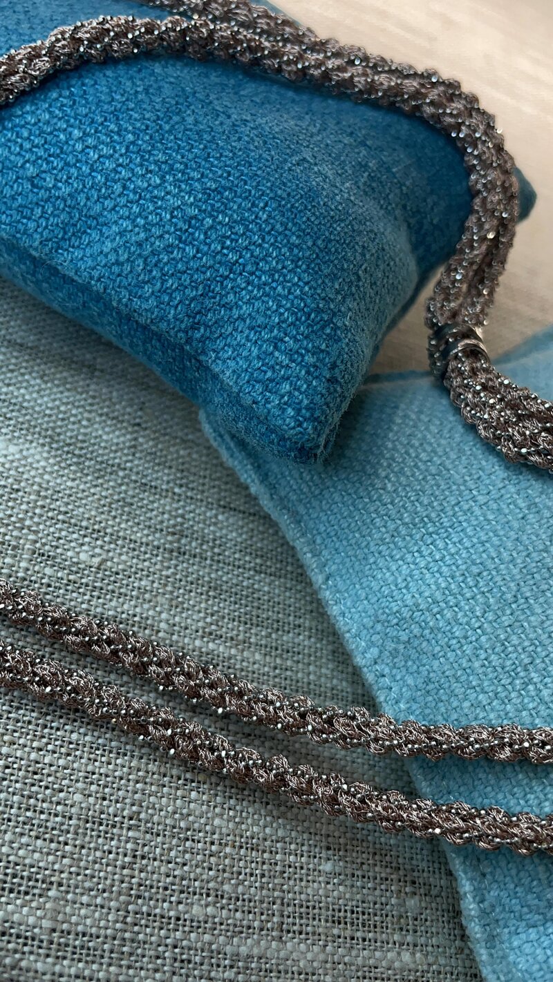 Collana in fili di seta e argento 925 intrecciati con chiusura gioiello a scorsoio regolabile.